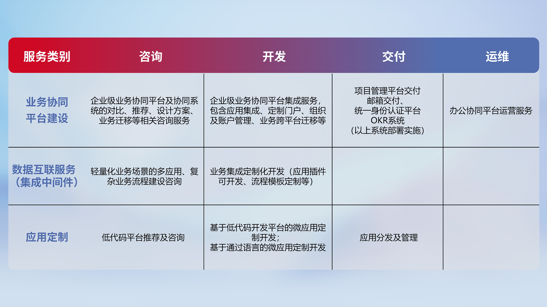 针对钉钉、、、企微、、、IDaas等平台级产品提供产品的规划、、方案、、交付、、定制化开发等服务,,,,实现如统一协同办公、、、、智能客户服务、、混合会议管理、、、智能数据查询、、等业务场景,,,实现数字化转型。。。。